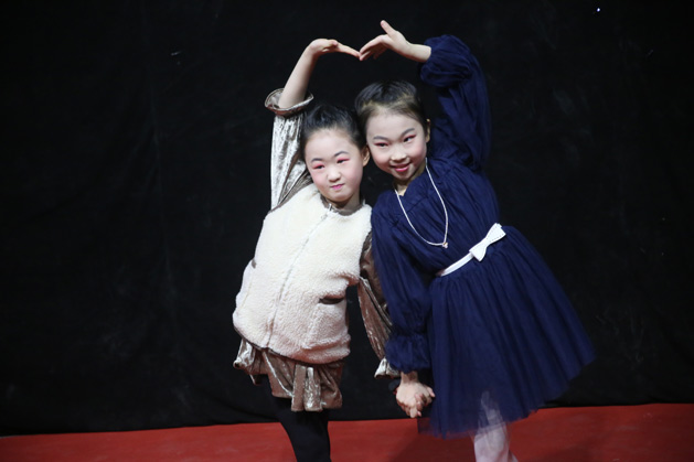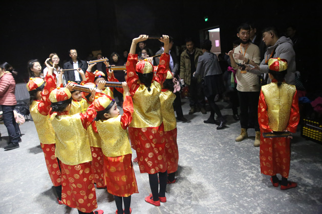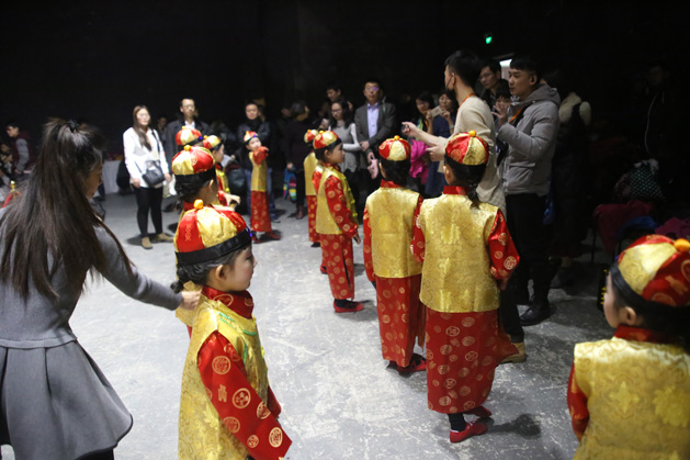 小演员们走过红毯,换上演出服装,在后台依然积极的备演,进行走位演练。