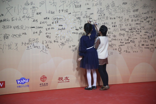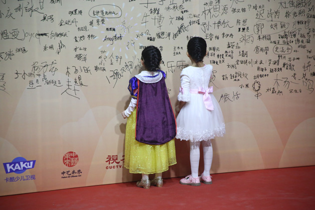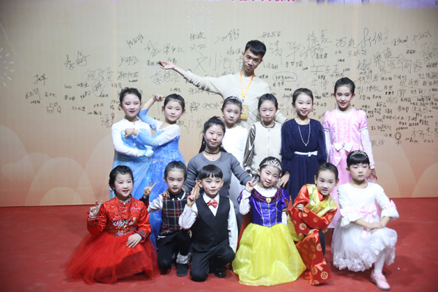 小演员们化好妆后,换上最漂亮的衣服,在红毯上秀出自己最靓丽的一面,并在活动签名版上进行签名,合影留念。